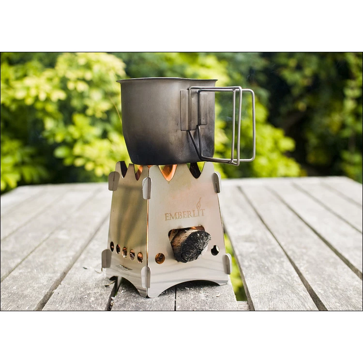 The EmberLit Stove weighs 11.3 oz (316 g) and is constructed of rugged stainless steel. Compare that to a full canister of fuel and burner! The stainless steel EmberLit is impervious to corrosion and remarkably strong. The EmberLit will hold the weight of any pot or pan that will sit securely without wobble. Like the rest of the EmberLit line, this stove comes with a lifetime guarantee because you are never going to wear it out. With use, the individual panels that make up the EmberLit may take on a slight warp. This is normal and doesnβt affect the assembly or durability of the stove.