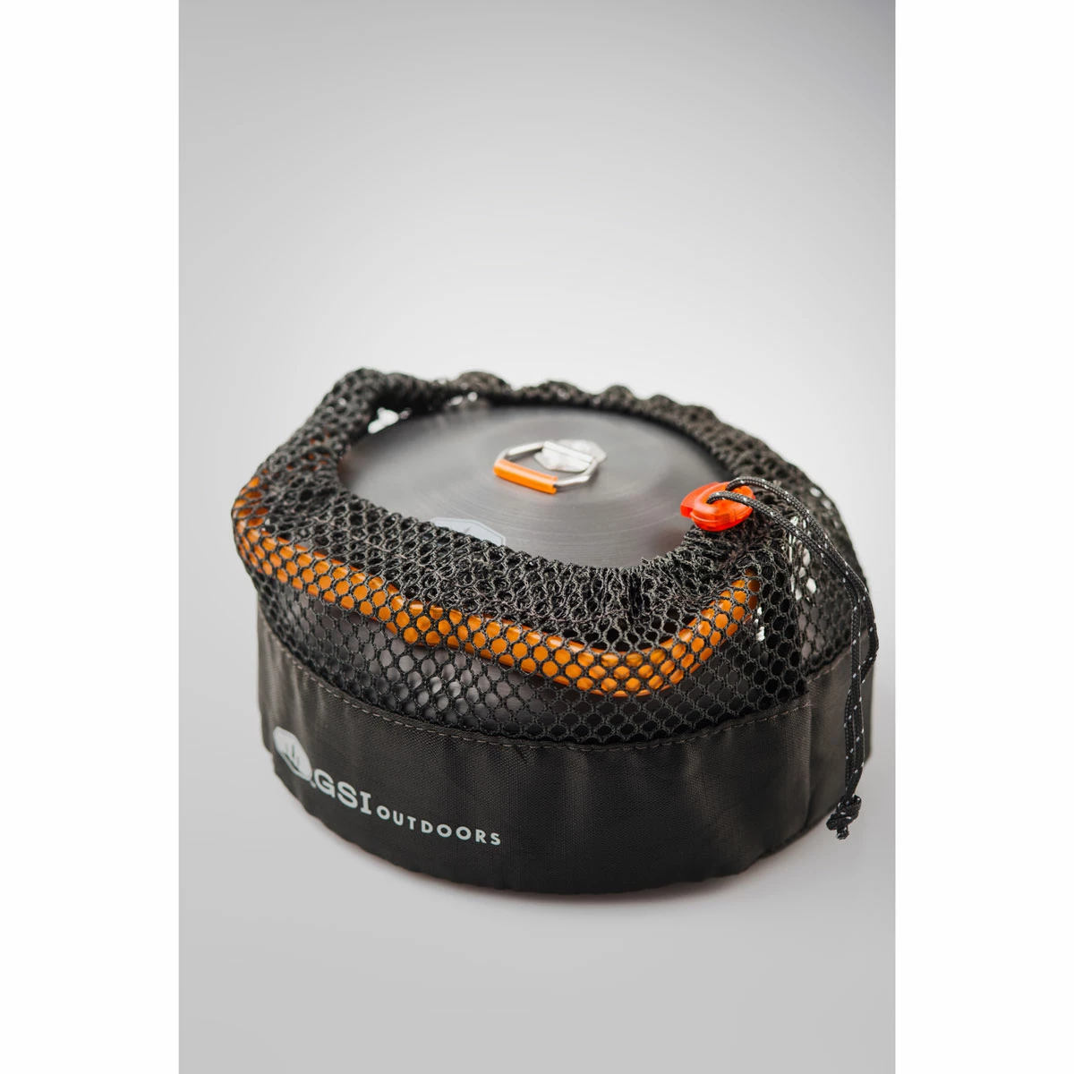 The GSI Halulite Ketalist II combines an integrated cooking and eating solution with an ultra-durable hard anodized aluminum 1 liter camping kettle. This efficient and ultralight set integrates a Folding Foon, insulated mug with sip-it top and nesting bowl into a 33 fl oz (1 liter) tea kettle with insulated handle and enough room to store a 110g fuel canister (sold separately) and all in a convenient, half-mesh storage bag.