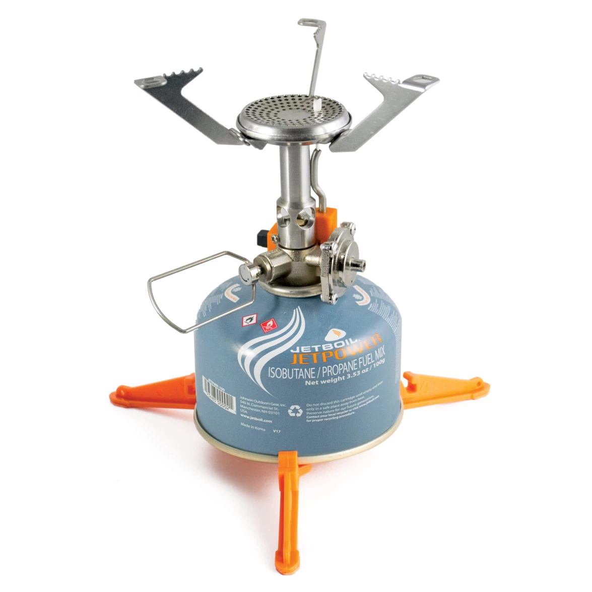 Meet the ultra-stowable, single burner stove that unleashes the power of a professional range. At 3.3 oz, the Jetboil MightyMo is almost impossibly small but features a mighty 10,000 BTU burner and four full turns of the regulator valve spindle for simmer control unlike anything else in the backcountry. MightyMo works together with FluxRing Fry Pan and FluxRing Cooking Pot (sold separately). Fuel sold separately.