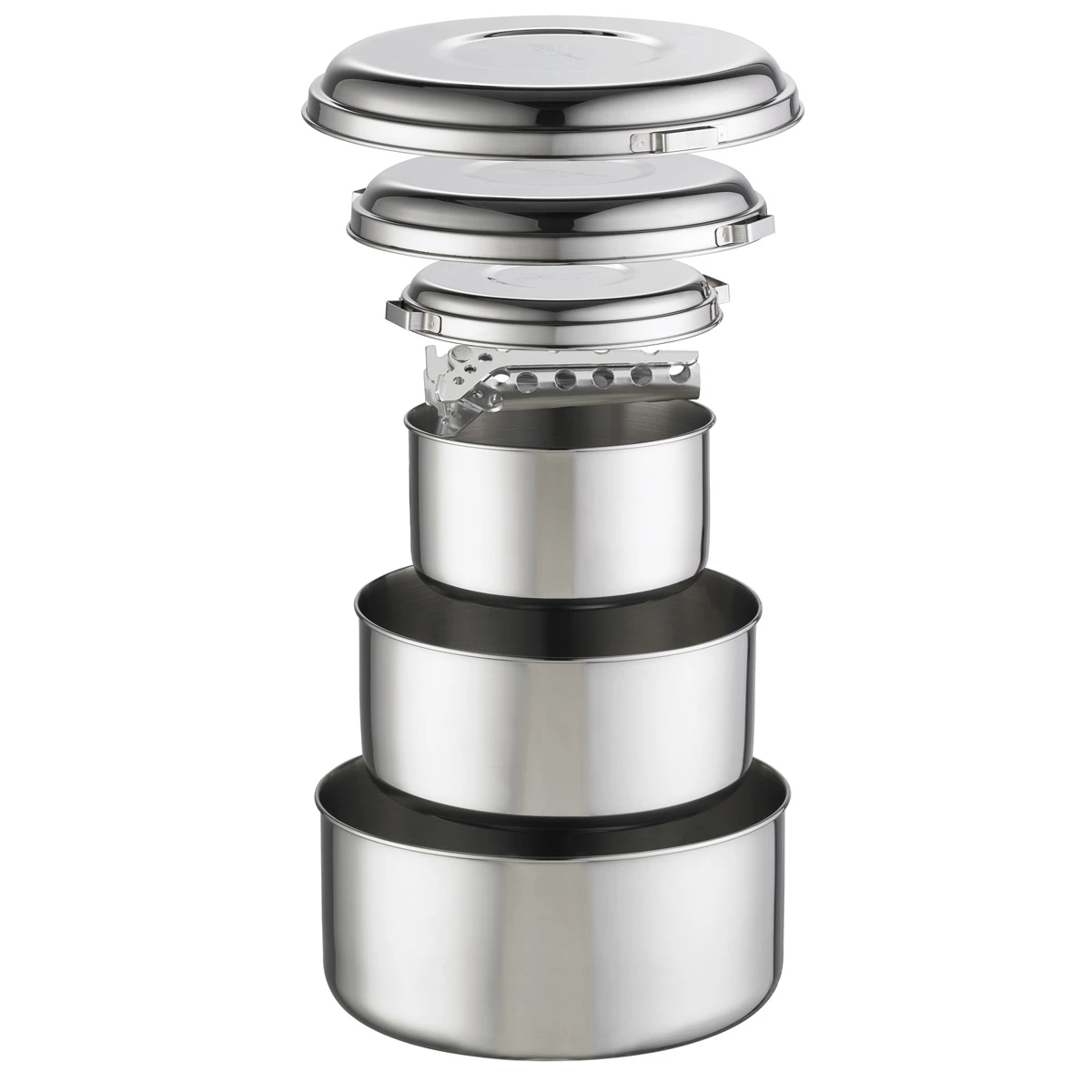 The MSR Alpine 4 group pot set is made from incredibly durable stainless steel, reliably standing up to even the most extreme conditions. Itβs perfect for heavy use by frequent campers, or by guides and institutions, where youβll be preparing a lot of meals on a wide range of adventures. Includes 3 pots and lids that can also function as plates, for a compact group cooking setup that stands the test of time.