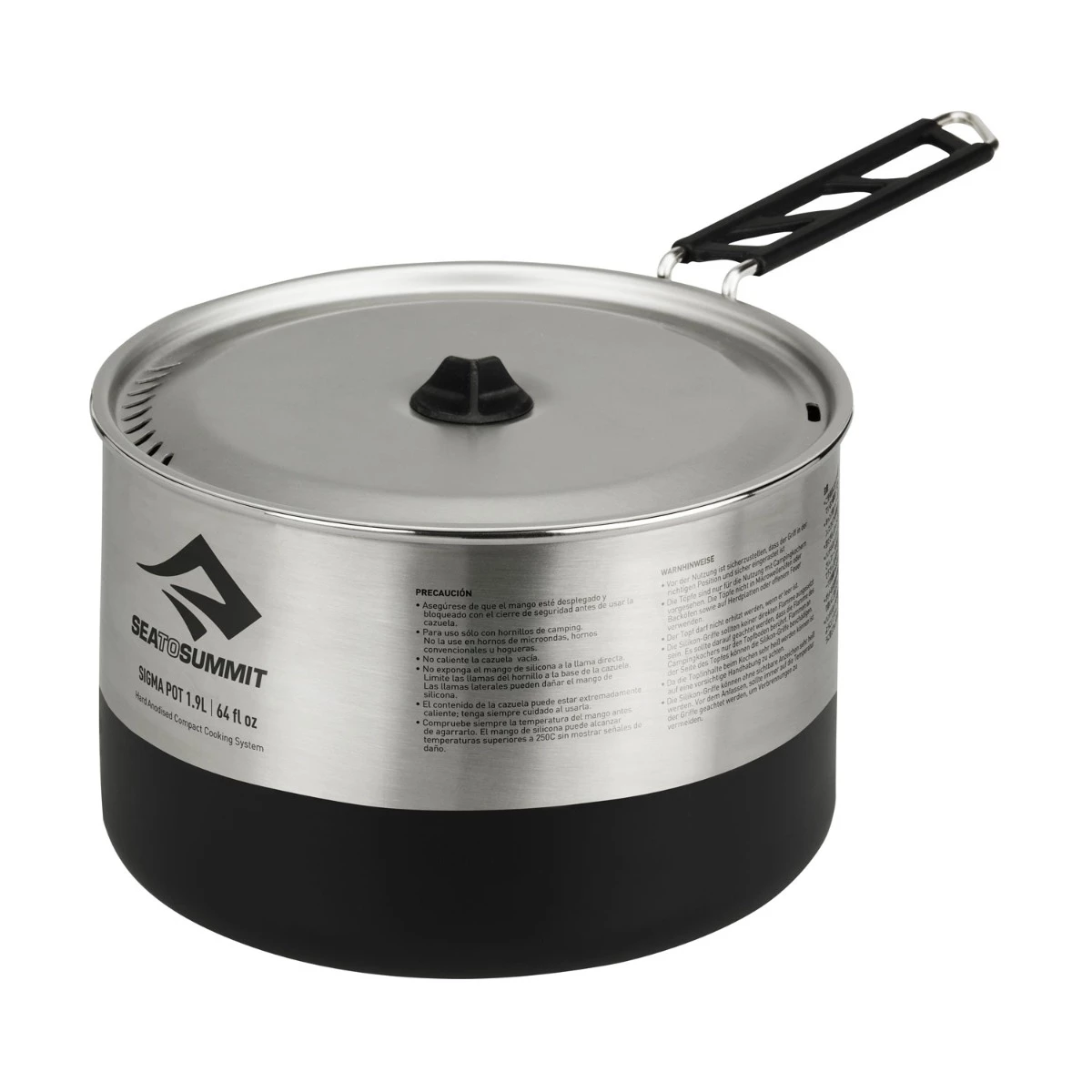 The Sigma series of cook pots brings technical features such as the Pivot-Lockβ’ handle (that locks securely into place during use and locks away for transportation), the silicone Lid Keepβ’ (to rest the lid on the side of your pot during cooking), and a grippy black base (for better heat absorption) to the realm of stainless steel cookware.