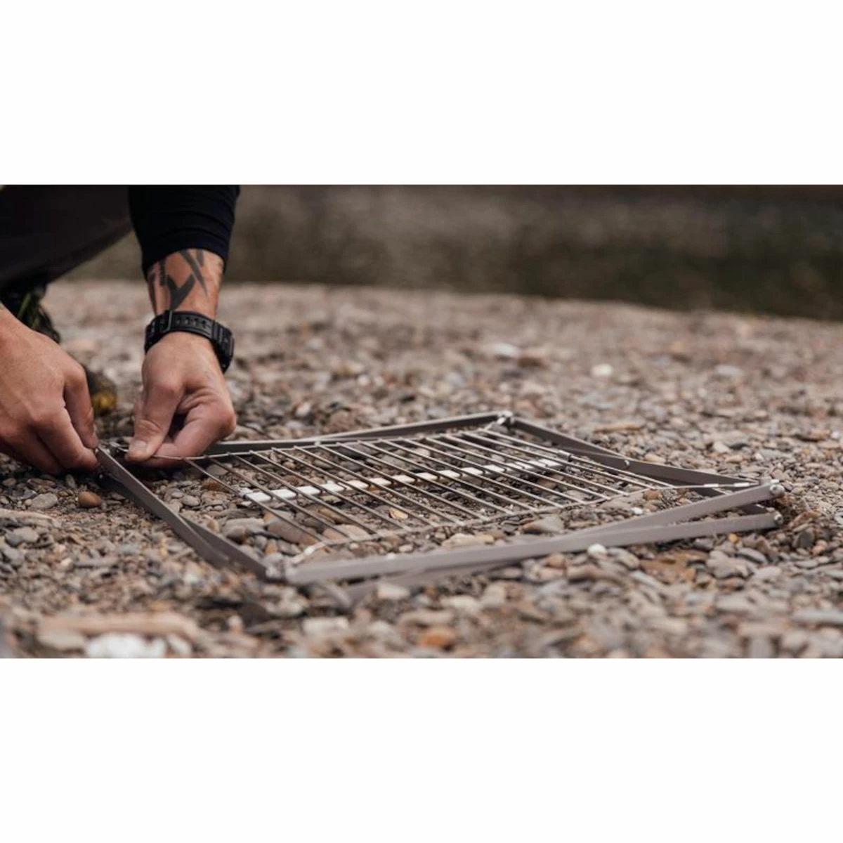 The Wolf and Grizzly Grill M1 Edition is a two part assembly for maximum versatility and packability: a frame that you spread open and a cooking surface that you unroll and secure in place. Want to adjust the height of your grill? No problem, just move the stainless steel stoppers to your desired height mode. Includes Fire Set steel striker.