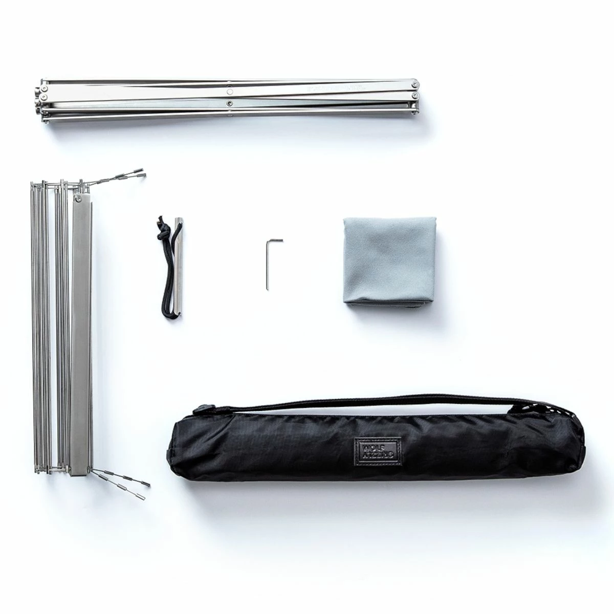 Includes: Rollable grill surface, foldable grill frame, premium carrying case, custom cleaning tool, microfiber cloth, compact allen key